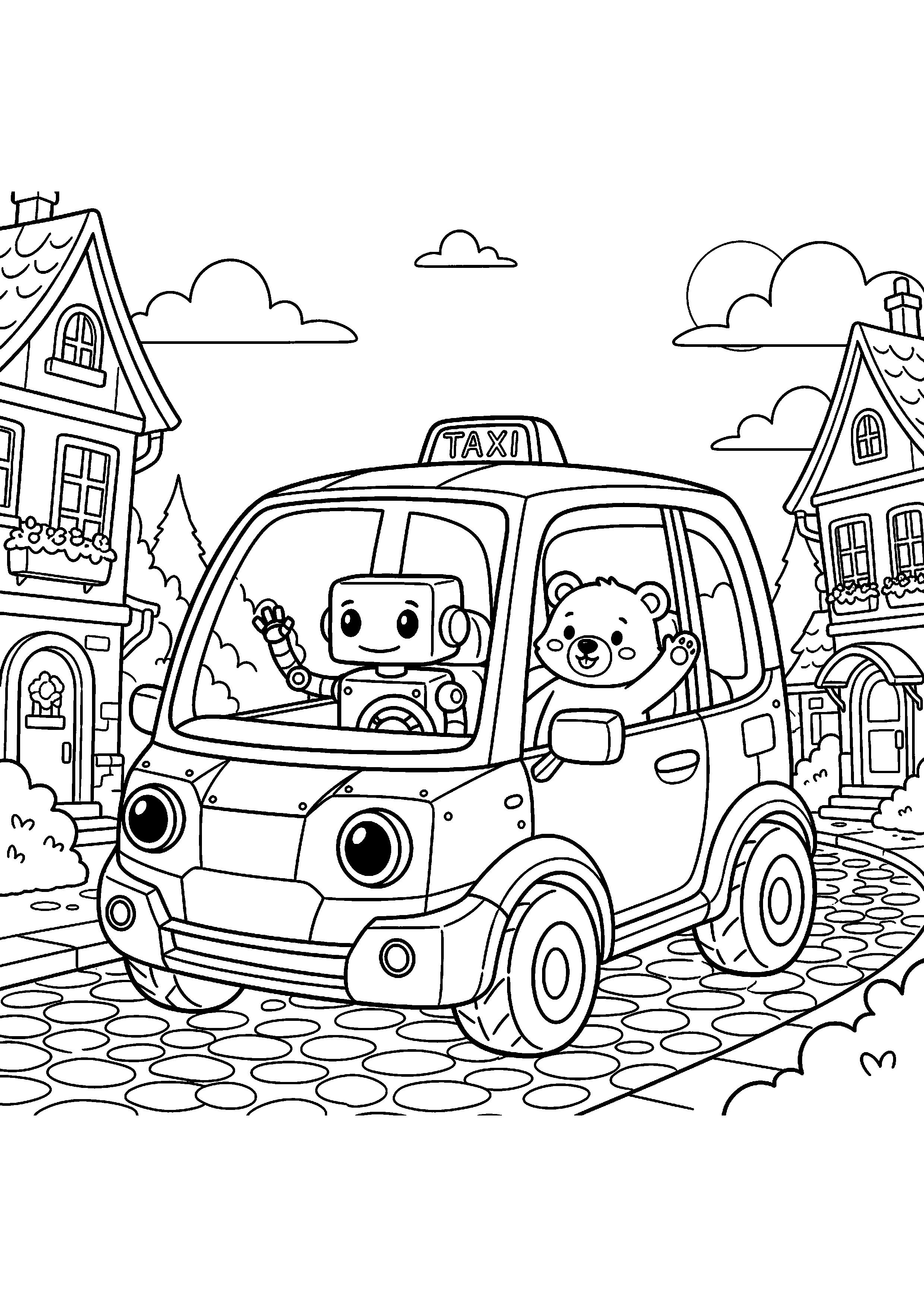 Here is a black-and-white line art version of the image for a coloring page, with a robot taxi.